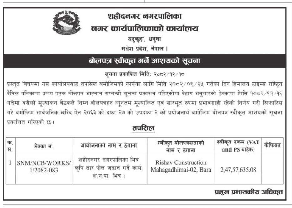 बोलपत्र स्विकृति गर्ने आशयको सुचना