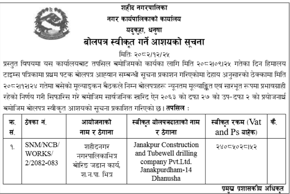 बोलपत्र स्विकृत गर्ने आशयको सुचना ।