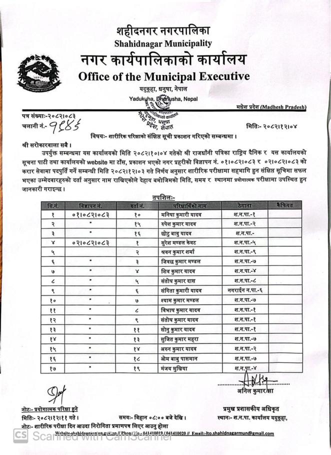 शारिरिक परिक्षाको संक्षिप्त सुचि प्रकाशन गरिएको सम्बन्धमा